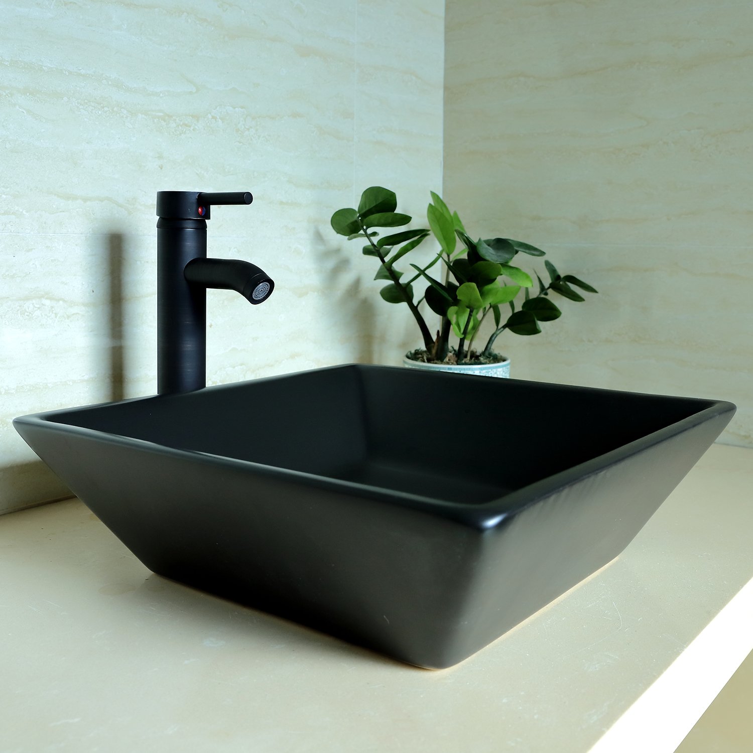 Walcut Black Square Ceramic Vanity Vessel Sink and Faucet Combo with